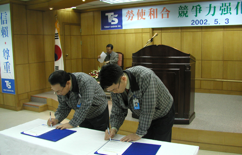 도레이새한은 창립 이후 상생의 노사협력 관계를 유지해왔는데 2001년 노동조합 주관의 에너지 절감 결의대회 개최, 2002년 소모적 임금 교섭보다 생산성 향상에 더 집중하자는 취지의 노사화합 경쟁력 강화 전진대회 등이 그 대표적인 사례이다. 회사 측에서도 선진적이고 합리적인 노사관계 구축을 위해 도레이와 교류하여 노사관계를 벤치마킹했으며, 사원들 의식구조 변화와 내부 고객만족 경영 실천을 위해 각종 설문조사 등을 활용해 그 결과를 공유하고 인지된 문제점들을 개선하는 데 노력을 기울였다. 도레이새한은 정부로부터 안정된 노사문화 구축을 인정받아 2002년 12월 노사관계 분야 최고의 상인 ‘신노사문화 대상’을 수상했다.