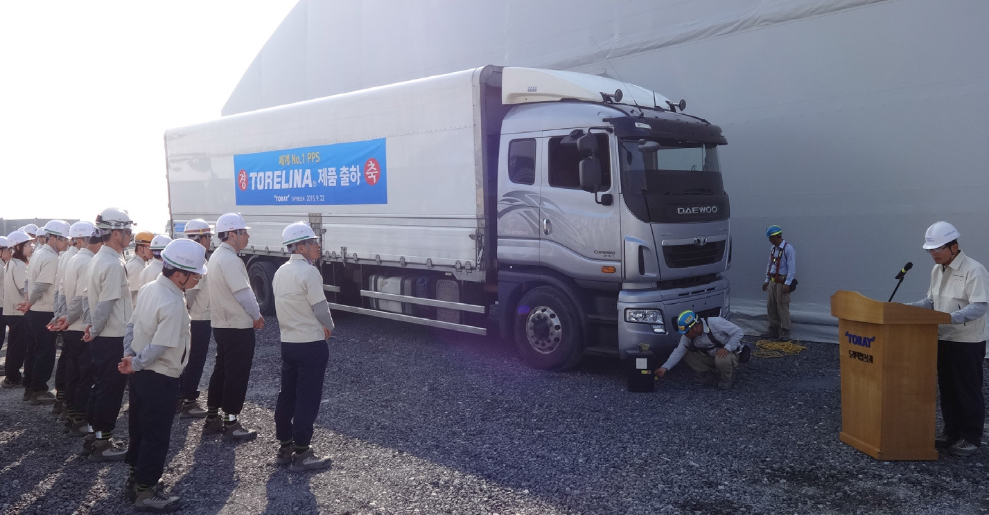 2015년 9월 군산공장의 임직원들은 설레는 마음으로 PPS 콤파운드 ‘TORELINA’의 첫 출발을 기념하는 제품 출하식을 맞았다.