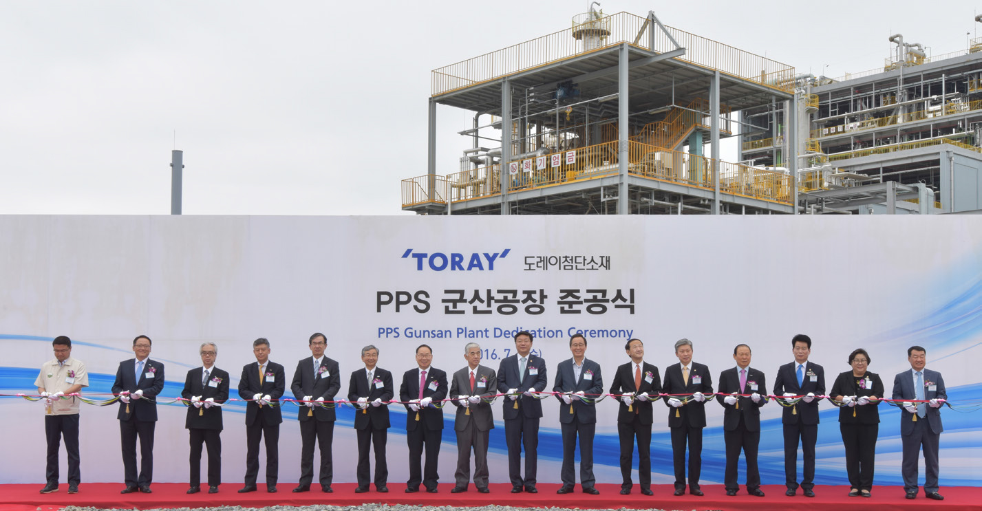 2016년 7월 기공 2년 만에 군산공장 준공식을 갖게 됐다. 도레이첨단소재는 이미 4월부터 공장을 본격 가동하여 PPS 수지와 콤파운드를 차질 없이 성공적으로 생산하기 시작했다. 준공식은 궂은 날씨에도 불구하고 주형환 산업통상자원부 장관, 송하진 전북도지사, 스즈키 히데오 일본대사, 문동신 군산시장 등 정·관계 인사들이 참석하여 성황을 이루었다.