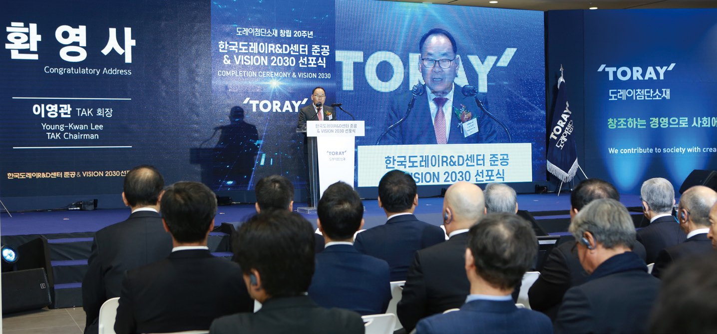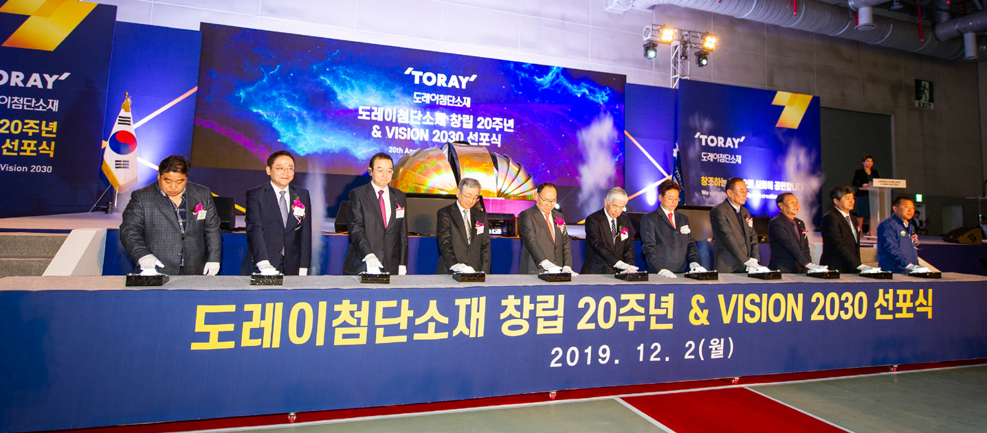 2019년 12월 한국도레이R&D센터 준공을 기념하고 중장기 전략인 VISION 2030을 선포하기 위해 이희범 前 산업통상자원부 장관, 김도연 前 교육과학기술부 장관을 비롯한 내외 귀빈을 초청해 센터 준공식과 VISION 선포식을 거행했다. 같은 날 오전에는 경북 구미의 구미코에서 이철우 경북도지사, 장세용 구미시장을 비롯해 고객사, 경영진과 임직원 등 300여 명이 참석하여 창립 20주년 기념식을 겸한 VISION 2030 선포식을 개최했다.